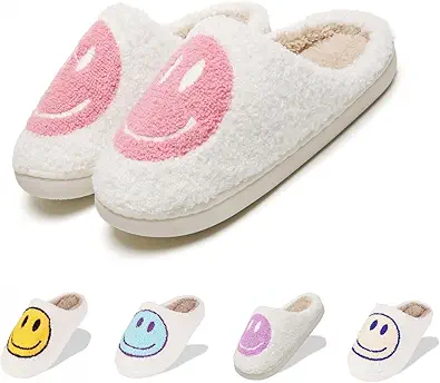 Fuzzy Slippers for Women Men, Cute Retro Fluffy Happy Face House Slippers, Plush Memory Foam Slippers for Women Indoor and Outdoor Cozy Trendy Slip-On Shoes
