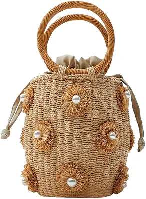 Flower Pearls Rattan Tote Bag Summer Beach Drawstring Straw Bucket Bag Diamonds Woven Handbag